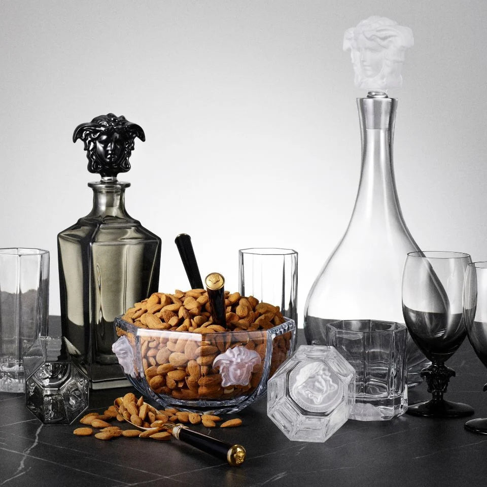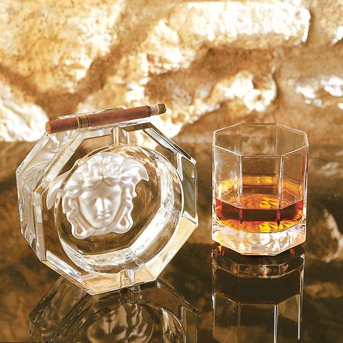 “Luxury Versace wine glasses, champagne flutes and crystal tumblers with signature design accents.”“Rosenthal meets Versace crystal drinkware styled on a refined bar setting.”