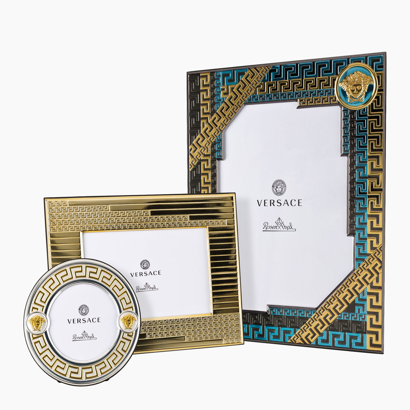 “Versace picture frames with gold, silver & black baroque Medusa detailing displayed in a luxury interior setting.”