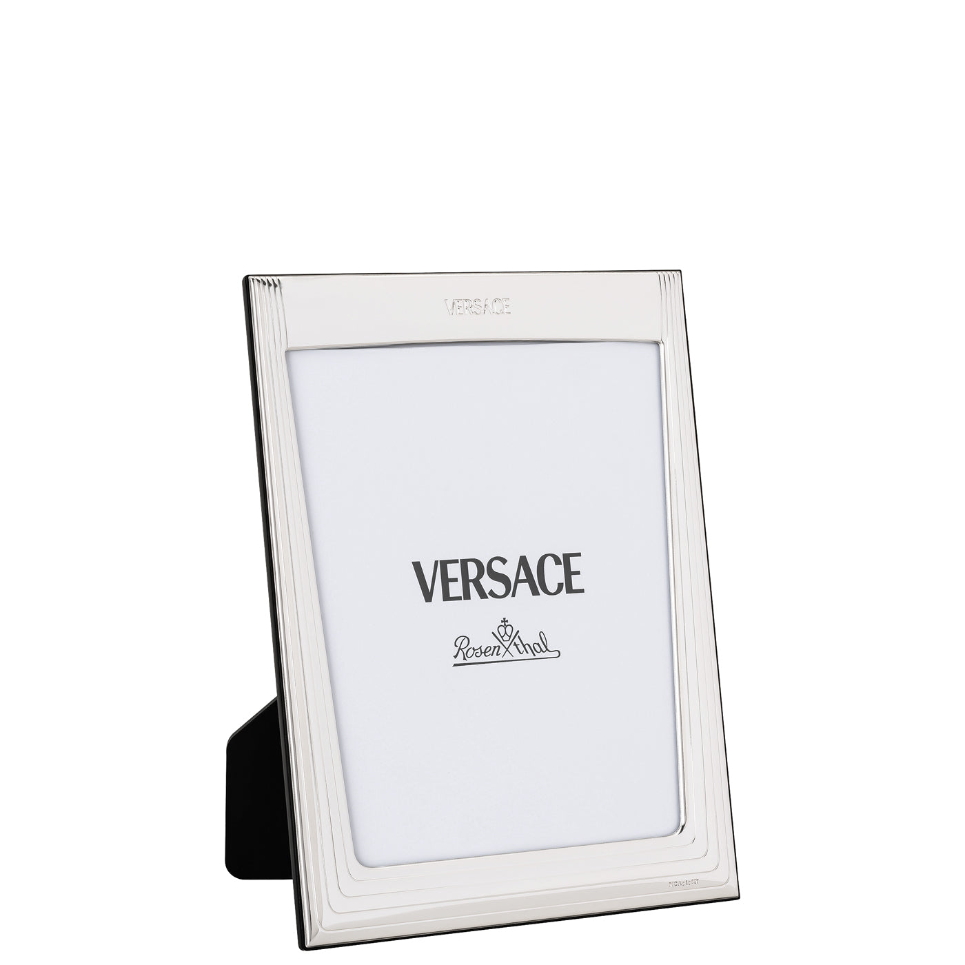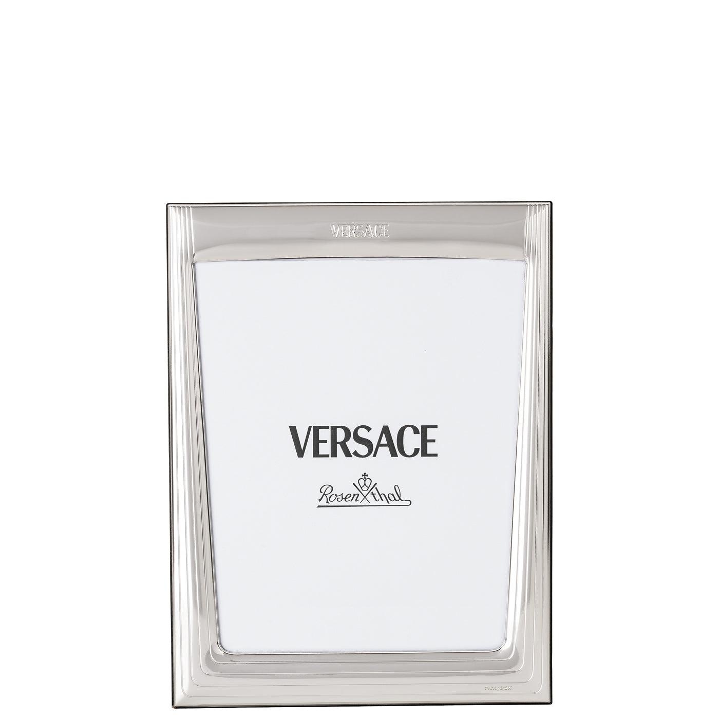 The Versace VHF14 Silver Picture Frame is a refined mid-size design from the Rosenthal meets Versace collection. Designed for 15 x 20 cm (6 x 8 inches) photographs, it features a bilaminated silver finish with a smooth matte surface, highlighted by linear detailing and crowned with the Versace logo.