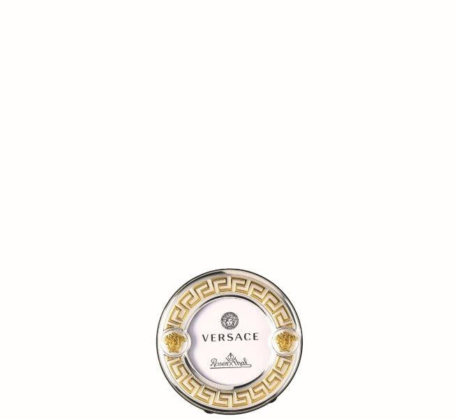 The Versace VHF4 Gold & Silver Picture Frame is the rarest miniature from the Rosenthal meets Versace collaboration. Measuring just 5 cm (approx. 2 inches) in diameter, this delicate round frame combines a sleek silver finish with a gold Greek key border and twin raised Medusa emblems, perfectly encapsulating Versace’s design DNA on a small scale.