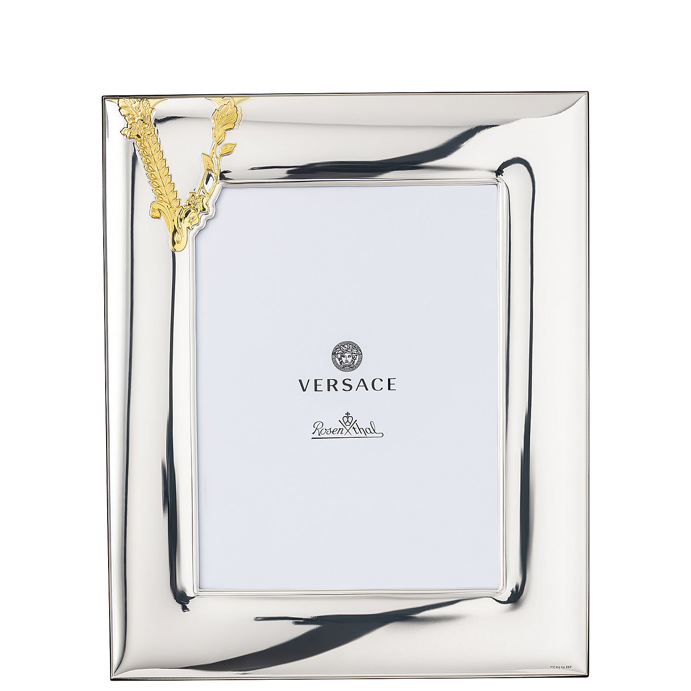 The Versace VHF8 Silver Picture Frame is a compact yet luxurious piece from the Rosenthal meets Versace collaboration. Made for 10 x 15 cm (4 x 6 inches) photographs, it combines a gleaming polished silver finish with a graceful gold wheat motif in the corner, an emblem of Versace refinement.